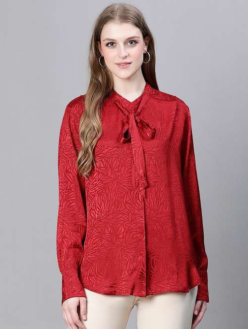 Love the class! Red Viscose Dobby top, long sleeves, bow tie knot fashioned neckline. The stylish placket pairs perfectly with smart pants for a super look.