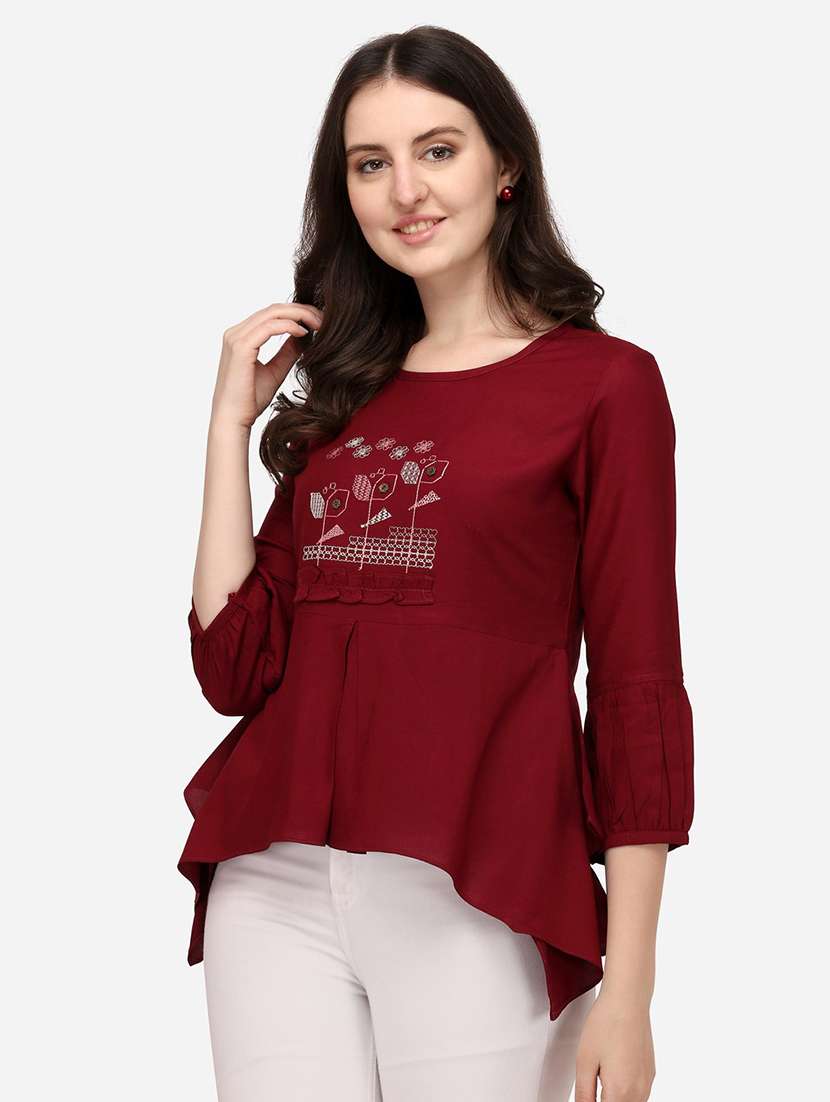 women embroidered three quarter sleeves asymmetric top