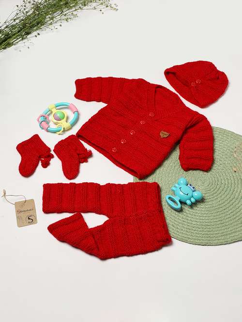 girls red self design sweater & pant set