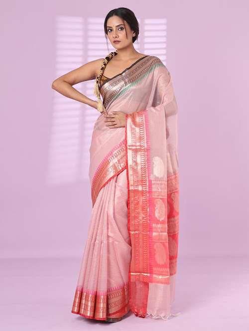Get an enchanting and classy look in this baby pink tissue soft saree. It has checkbox weave pattern all over with simplicity. This saree has Ganga Yamuna borders with intricately woven ethnic designs with zari. The contrasted red pallu is highlighted with zari woven patterns and paisley motifs for a loving look.