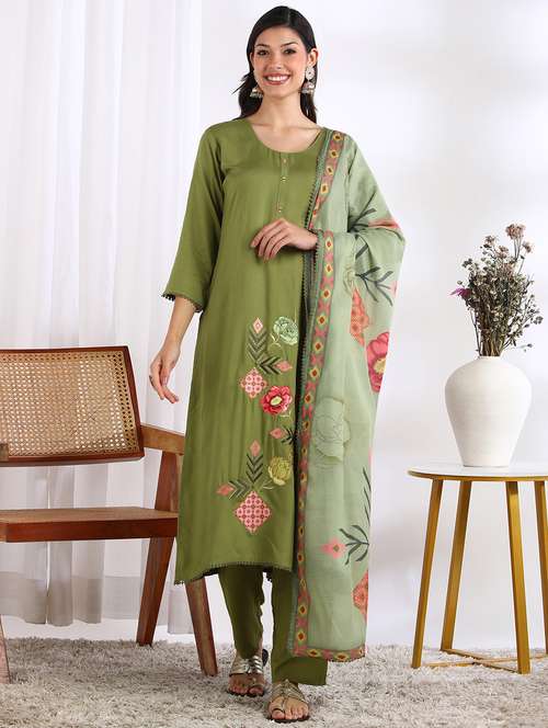 globus women black scalloped hem bell sleeves floral embroidered kurta & straight pant festive set
