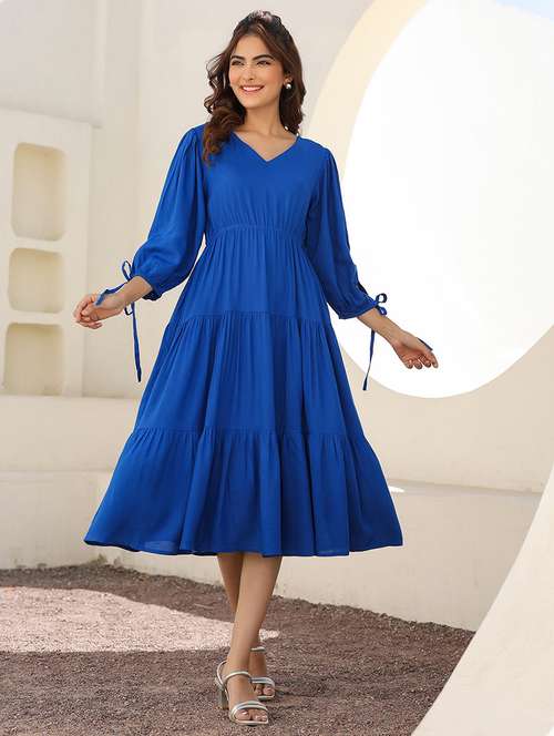 The royal blue rayon tiered dress is a blend of elegance and comfort. Featuring a flattering v-neck and a tiered dress, it adds a graceful flow to your every step. The cinched waist with a practical side pocket beautifully defines the silhouette, while the short balloon sleeves with chic tie-up detailing provide a stylish touch. Perfect for casual outings, this dress is all about effortless charm.