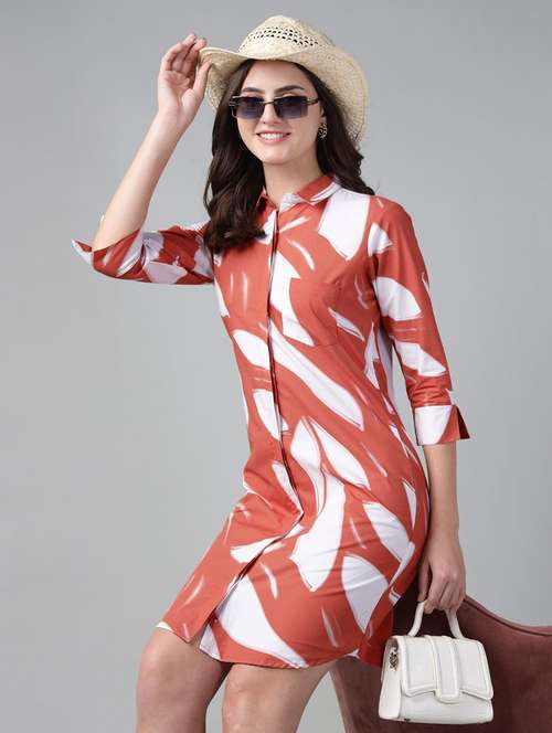 Style this rust abstract printed formal shirt dress from Hancock made with cotton with high heels and wrist watch for a classy look.