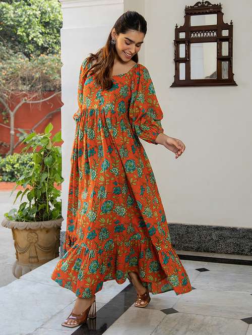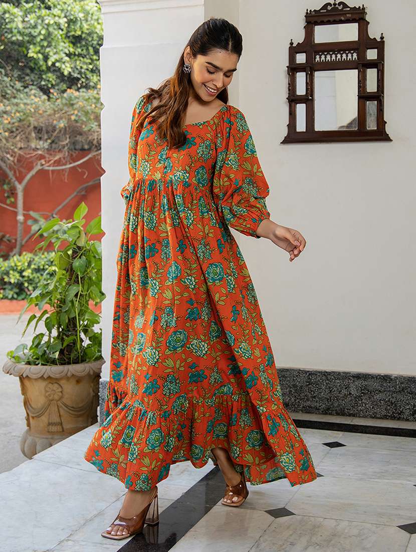 - » women rust floral printed fit & flare dress