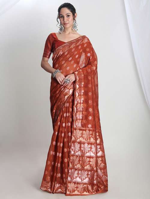 Radiate understated elegance with this rust linen blend jacquard saree, adorned with a beautifully woven floral pattern that adds depth and charm. The rich texture of the linen blend ensures a graceful drape, while the muti colored jacquard weaves spread throughout enhances its timeless appeal with a touch of opulence. Lightweight yet sophisticated, this saree is perfect for festive gatherings, celebrations, and special occasions. Pair it with a complementing blouse and minimal jewellery for a refined and effortlessly chic look.