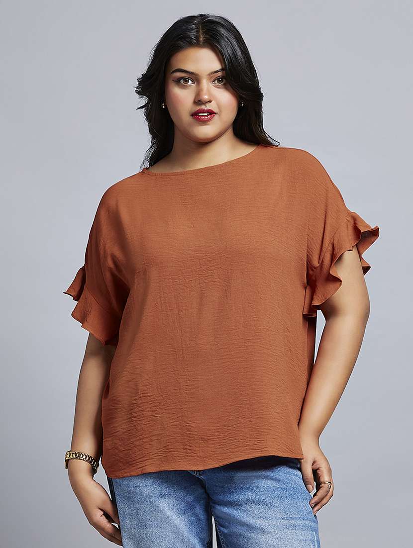 - » gloplus women rust round neck extended ruffle sleeves plus size workwear top