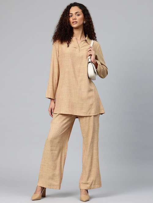 This co-ords set consists of rust solid A-line shirt-collar top, full sleeves, button-down closure, and matching straight-fit trousers with a partially elasticated waistband. Made from soft, breathable rayon for all-day comfort.