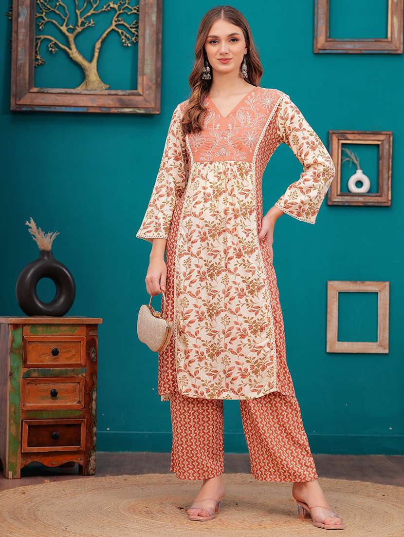 - Find gorgeous sets of ethnic wears in trending designs in orange colors suitable for casual wear of occasions.