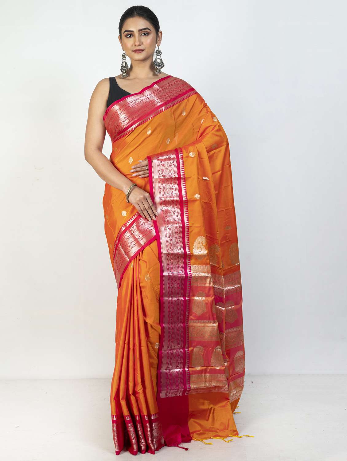 Detailed Craftsmanship: Meticulous handwork and embellishments adorn the borders and pallu, showcasing the artistry of skilled artisans.