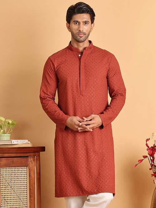 Rust Embroidered and Sequins kurtas, Rust straight knee length kurta, has a mandarin collar, long sleeves, straight hem.