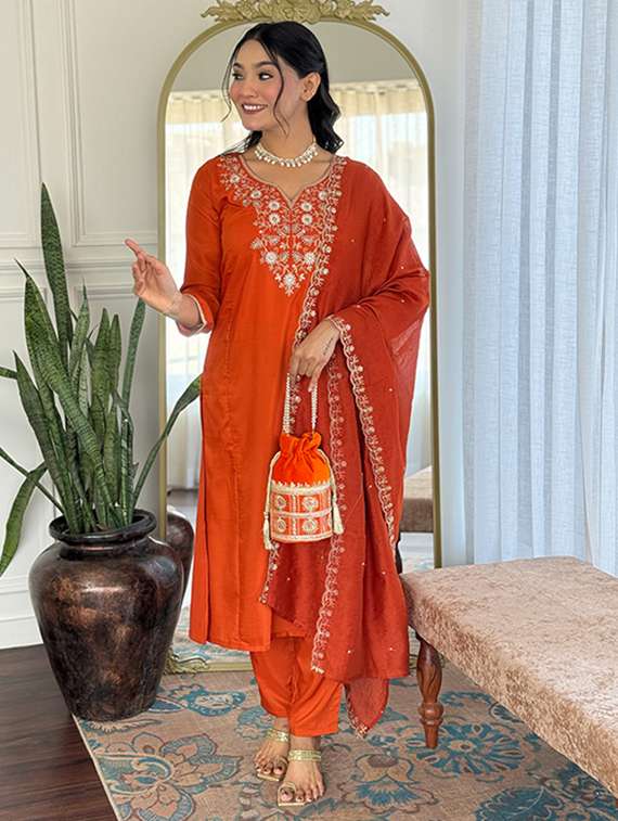- Find gorgeous sets of ethnic wears in trending designs in rust colors suitable for festive wear of occasions.