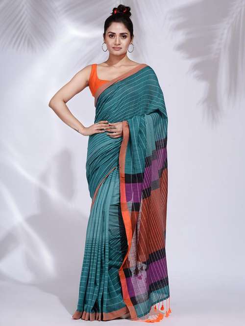 women's stripes teal colored saree with blouse