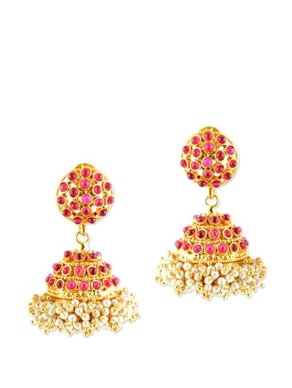 #2 traditional gold jhumkas with pink stones and faux pearls & similar products...