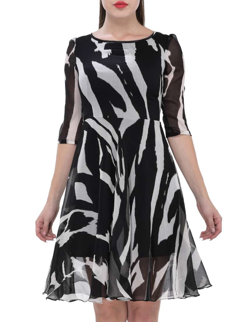 #1 black and grey printed chiffon fit and flare dress & similar products...
