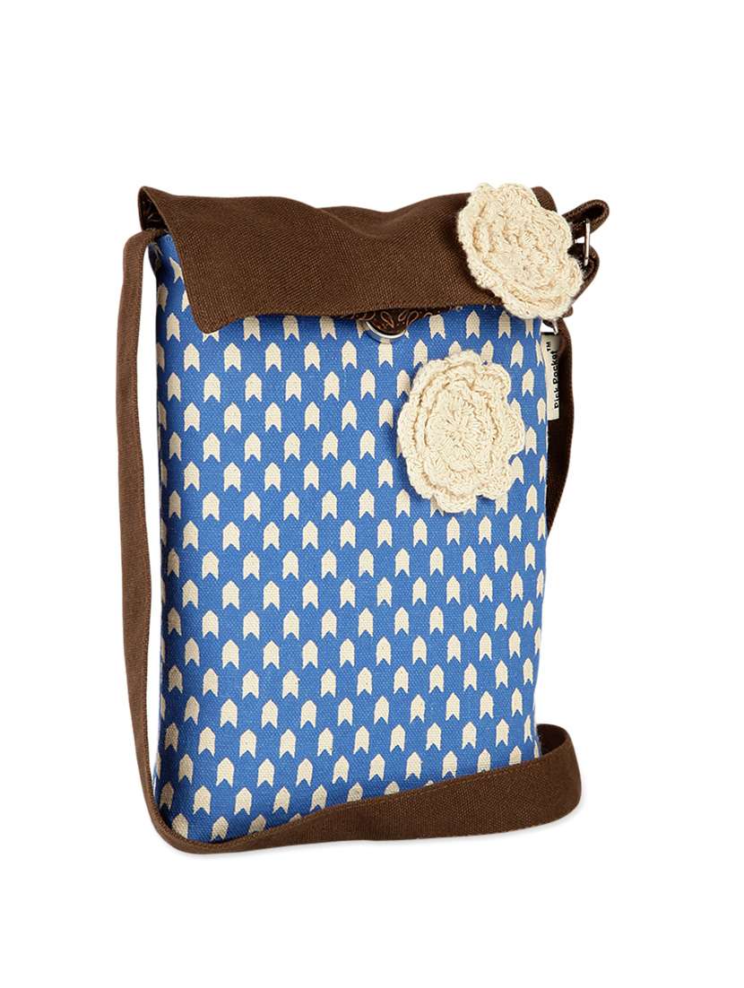 #5 stunning blue and brown flap sling bag with crochet floral embellishments & similar products...