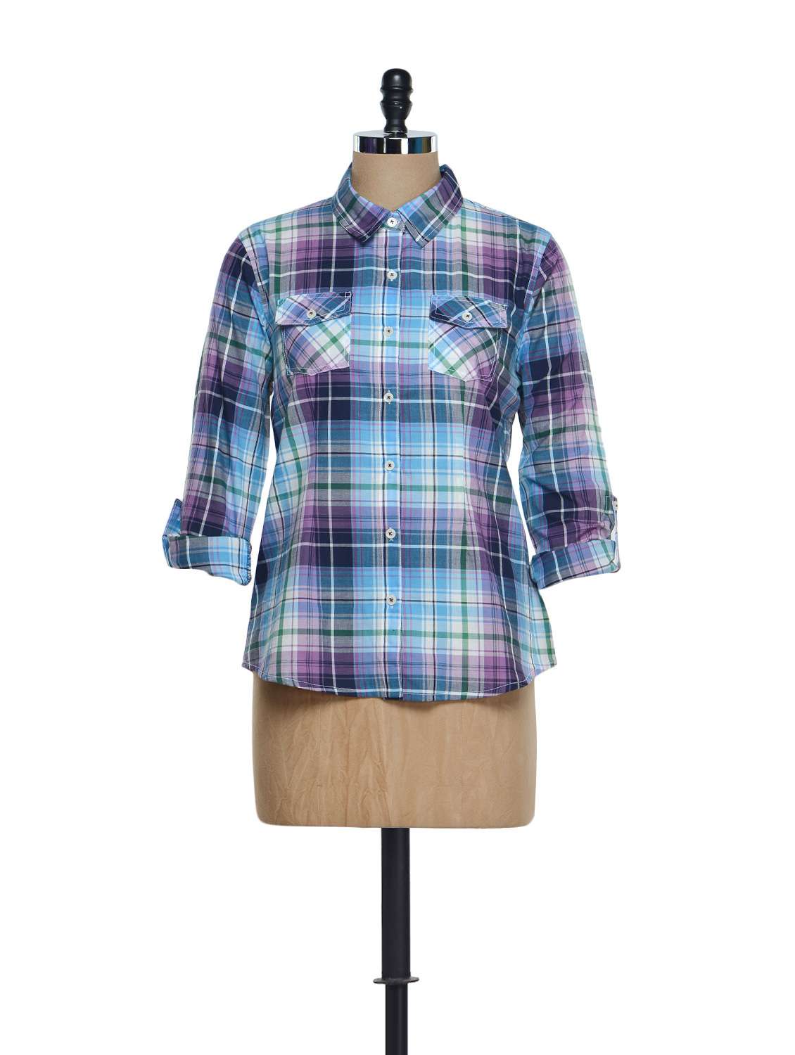 #2 blue and purple checkered prints roll-up sleeved cotton shirt & similar products...