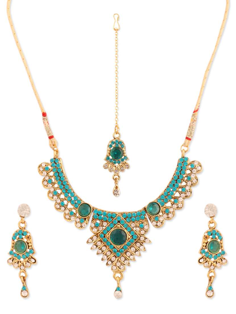 #2 sky blue and gold stone-studded necklace, earrings and maangtika set & similar products...