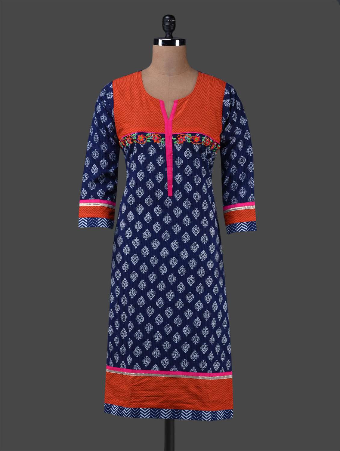 #1 blue embroidered yoke printed cotton kurta & similar products...