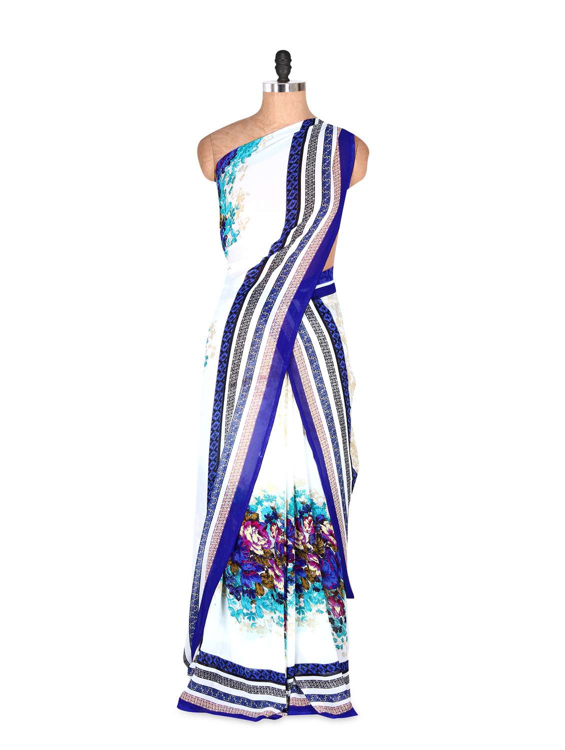 #1 amazing blue and white floral printed art silk saree with matching blouse piece & similar products...