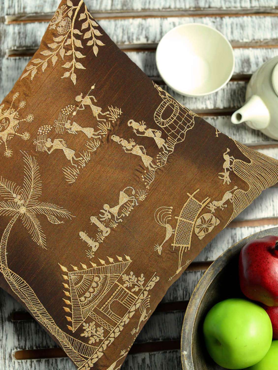 #1 warli art embroidered brown and gold cushion cover & similar products...