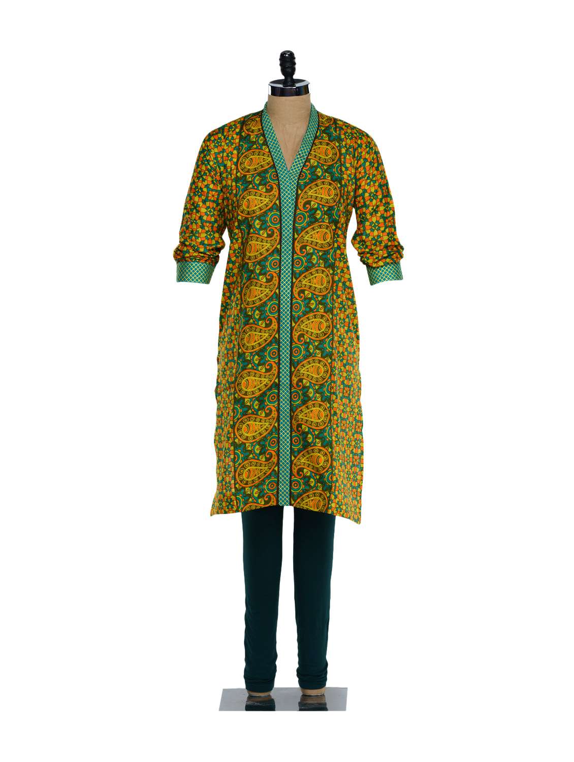#1 green and yellow paisley print cotton kurta with a teal green lycra churidaar & similar products...