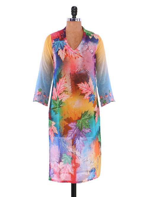 #1 multicoloured leaf printed georgette kurti & similar products...