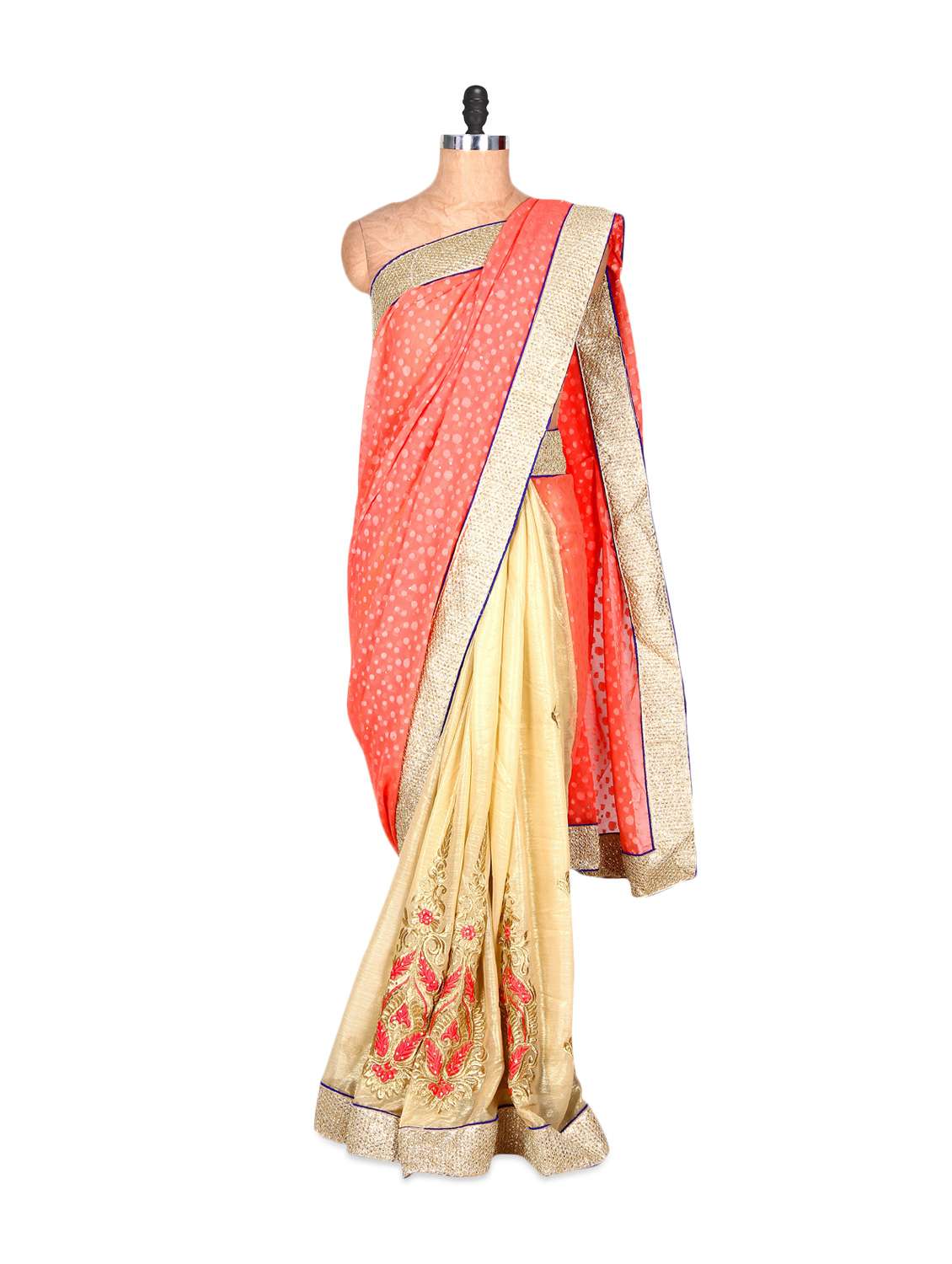 #1 coral orange and cream silk sari with thread embroidery, with matching blouse piece & similar products...