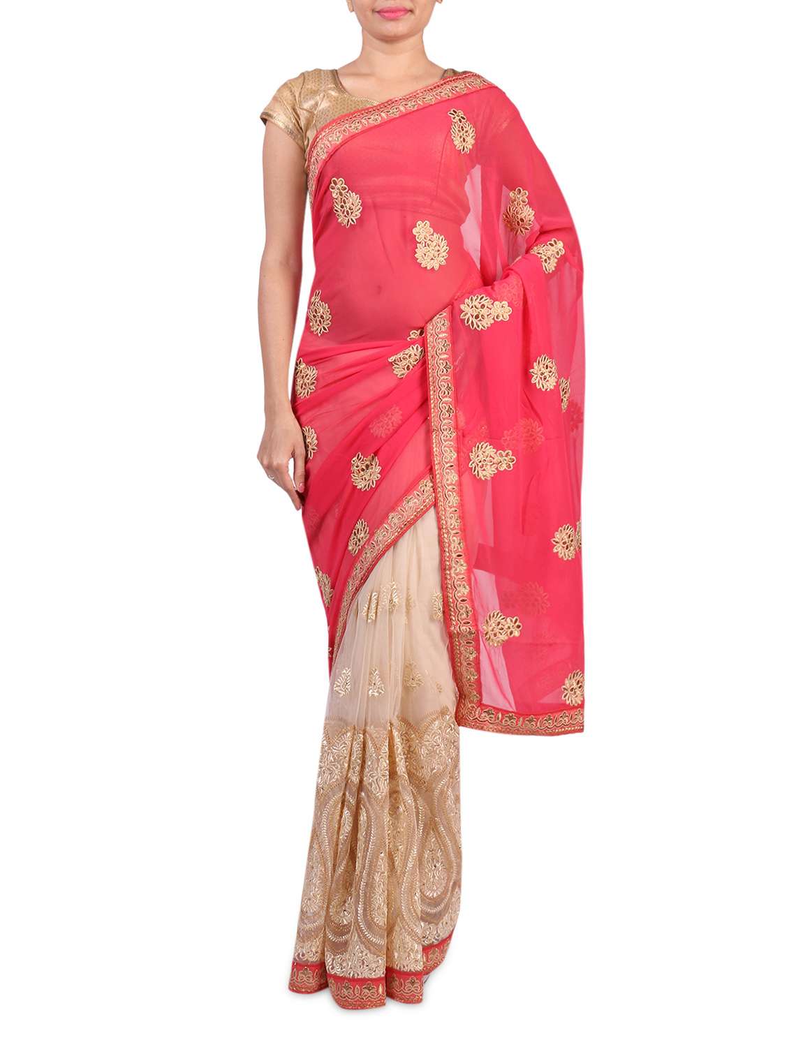 #1 pink georgette and beige net saree & similar products...