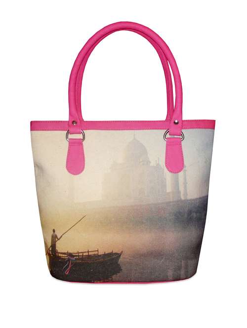 #1 fuchsia pink stylish taj mahal and boatmen print tote bag & similar products...