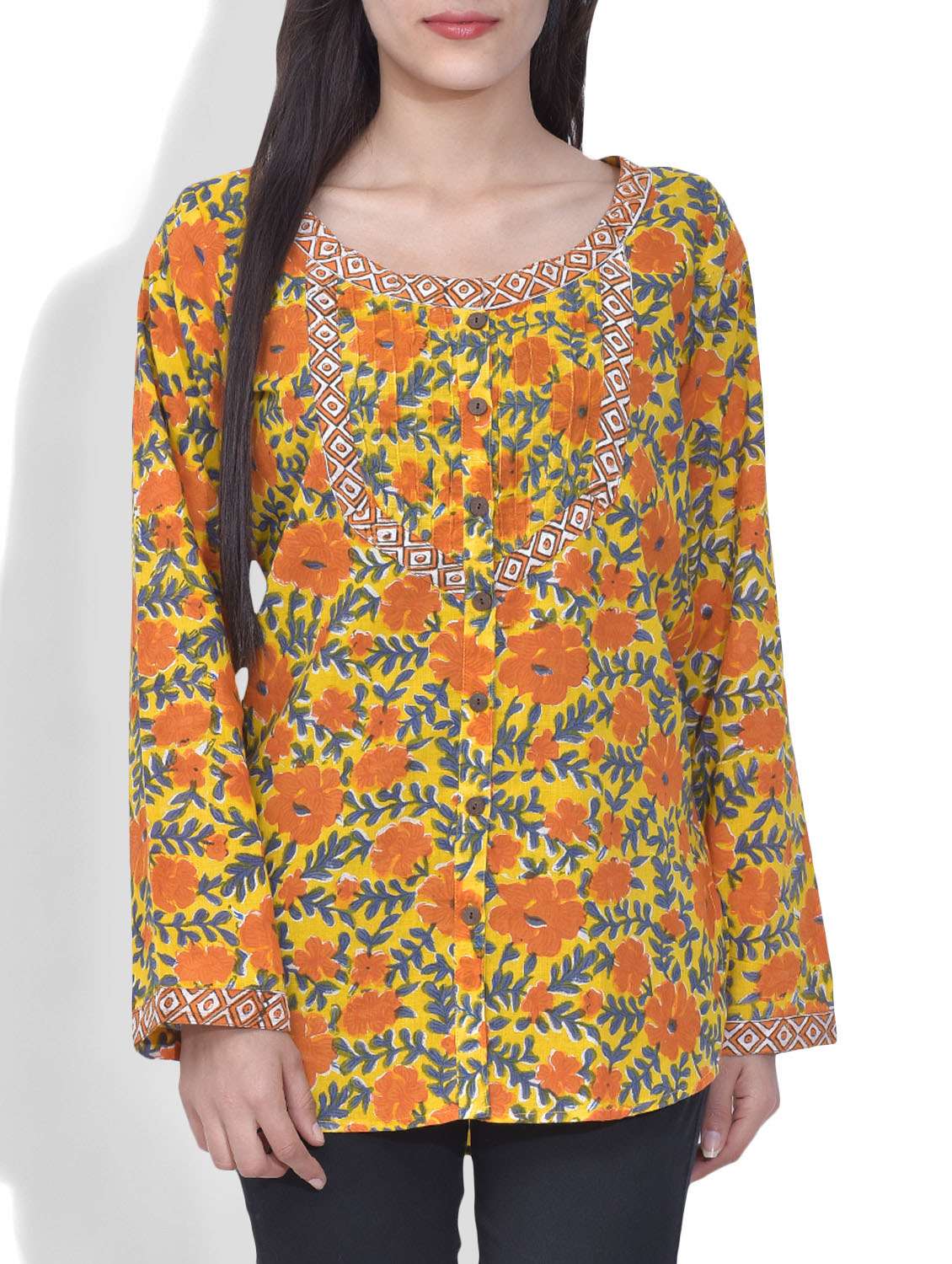 #2 yellow button up floral block printed cotton top & similar products...