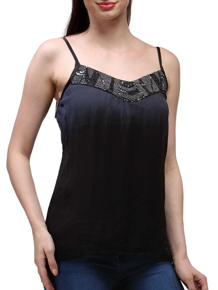 #2 solid black embellishment spaghetti strap crepe top & similar products...