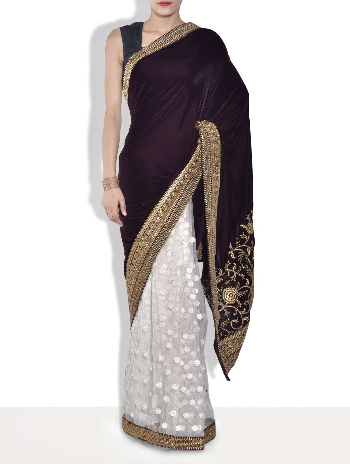 #1 white and coffee brown embroidered velvet saree & similar products...