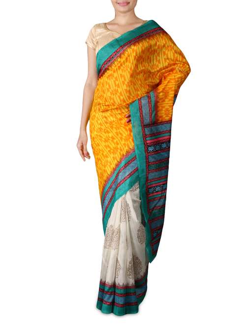 #1 White and Yellow Printed half and half Silk Saree & similar products...
