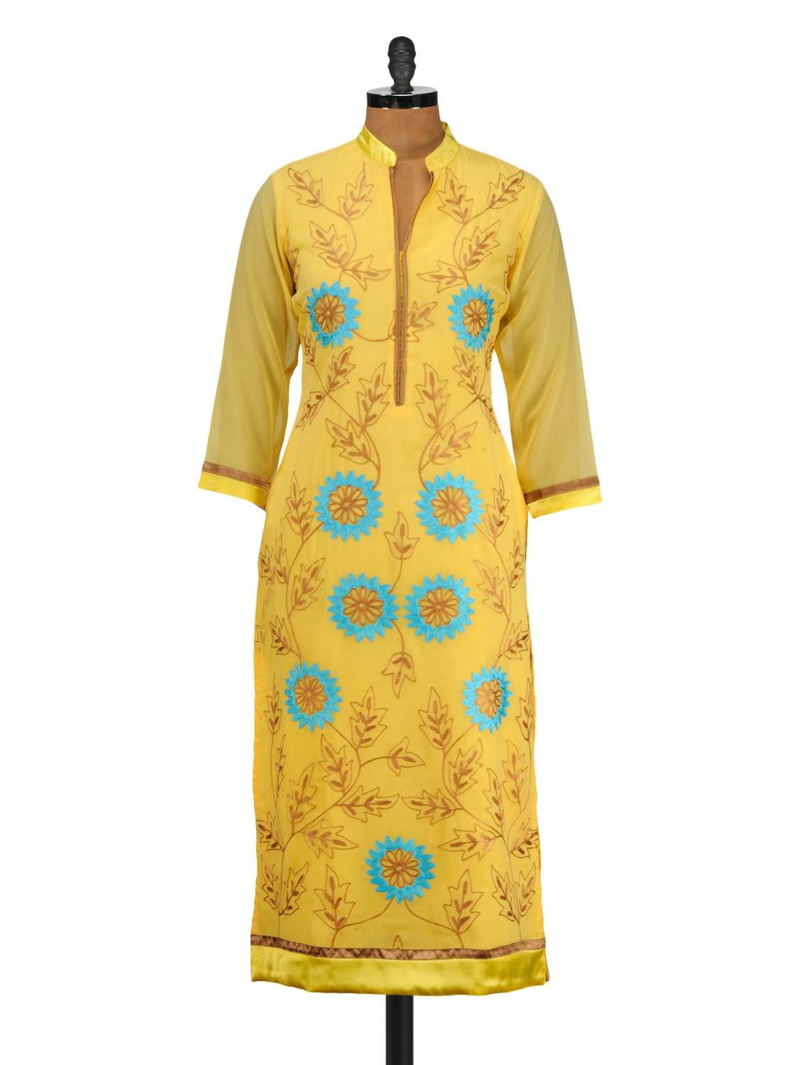 #1 yellow floral embroidered poly georgette kurta & similar products...