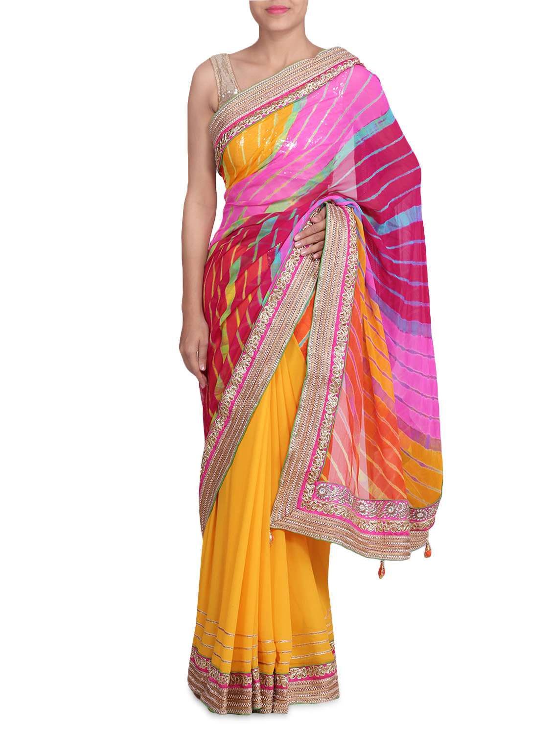 #1 yellow lehariya saree with lace border & similar products...