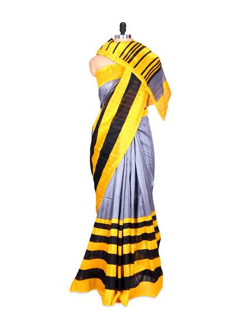 #1 yellow and grey bhagalpuri art silk saree with black stripes, with matching blouse piece & similar products...