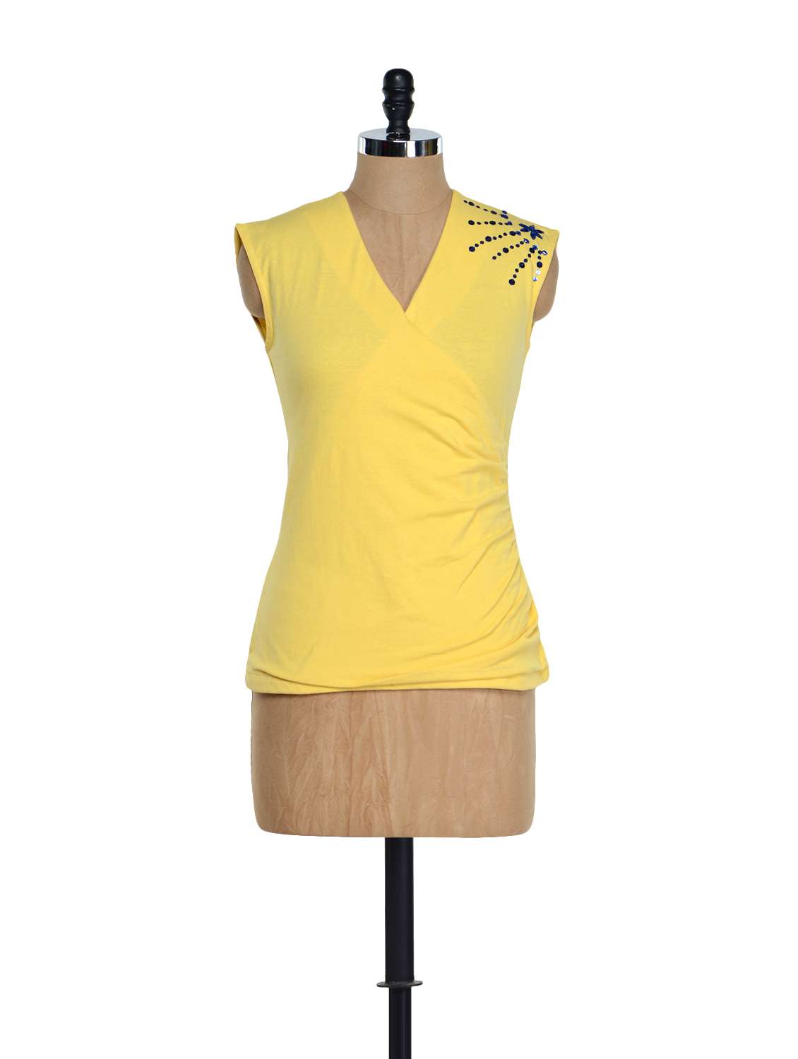 #2 yellow faux wrap top with embellished shoulder & similar products...
