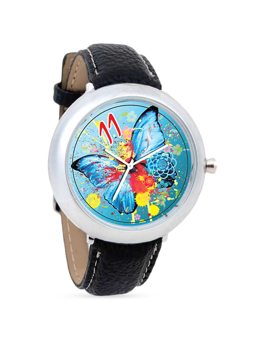 #4 black leather wrist watch with butterfly printed dial & similar products...