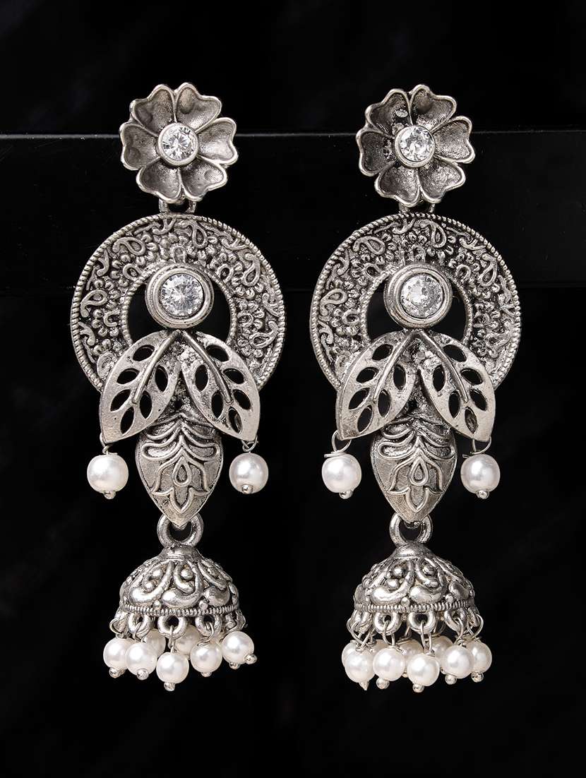 - » adiva oxidised silver-plated white stone & pearls floral shaped jhumka earrings