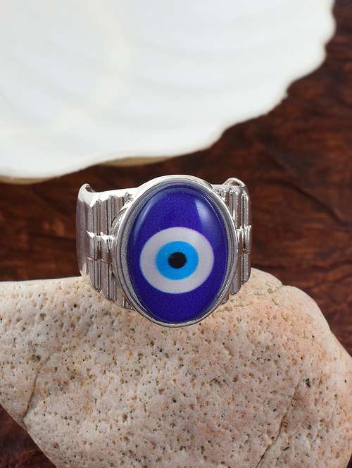 Brass Silver plated Evil eye free size Adjustable Finger ring for bad evil forces protection. Big, broad, free size Evil eye bad affect protection. Looks rich, stylish and impressive, this is real big size energised evil eye finger ring jewellery to solve money problem, office problems, job problems and other health problems.