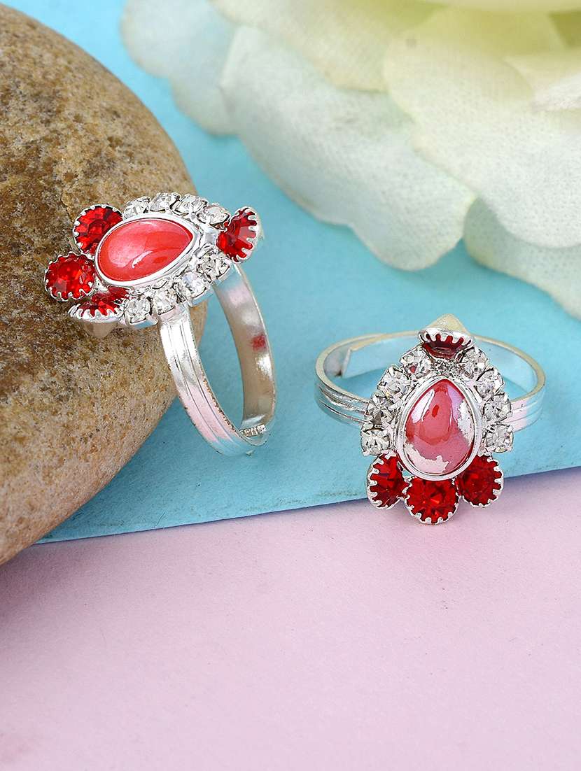 A Silverplated limited edition designer pair toe ring, this is handcrafted work with elegant Rasrawa work and studded with Red CZ. Adjustable band, fits easily into any toe finger. Excellent top quality finish, with a stunning design. It combines, traditional with modern look. Pair these with Gold plated anklets from Memoir, and flaunt these elegant foot jewellery ornaments. They match well with all Indian and western dresses, and can be worn on all occasion. An all season wear. This also makes an excellent gifting option, for all age groups.
