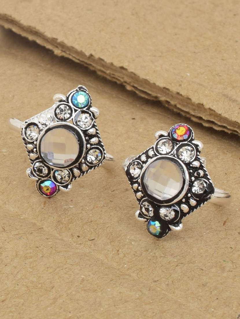 A silver plated designer toe ring, this is studded with white cz pure white cubic zirconia, adjustable band, which fits easily into any toe finger. excellent top quality finish, with a stunning design. it combines, traditional with modern look. pair these with anklets from memoir, and flaunt these elegant foot jewellery ornaments. they match well with all indian and western dressess, and can be worn on all occasion. an all season wear. this also makes an excellent gifting option, for all age groups.