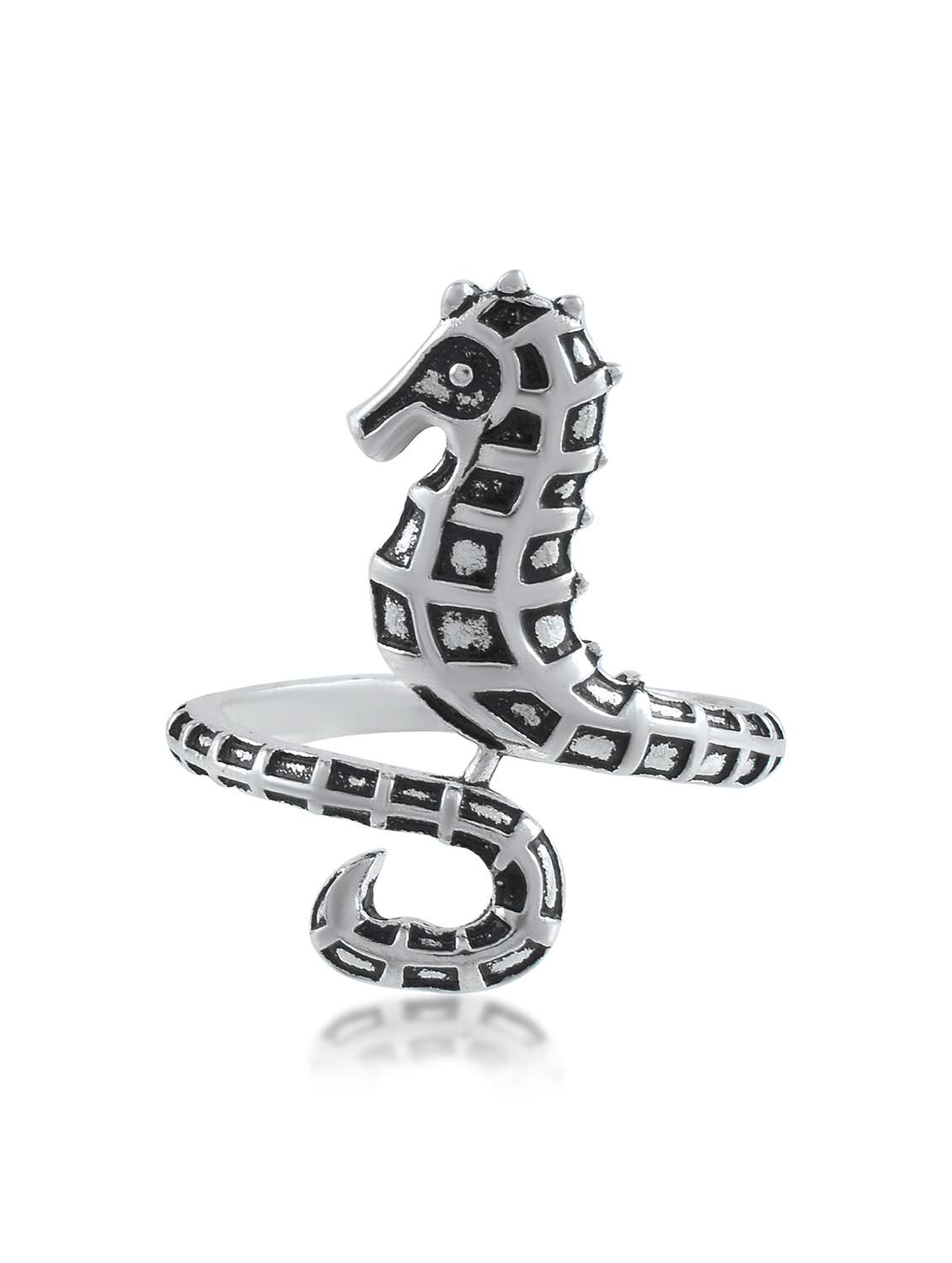 Dive into oceanic elegance with this exquisitely crafted seahorse ring. The distinctive design features an intricately detailed seahorse motif with a mesmerising geometric pattern that adds depth and character. Crafted from brass with a premium antique silver plating, this statement piece captures the vintage aesthetic perfectly. The wraparound design gracefully curves along your finger, making it a unique conversation starter. The ring showcases superior craftsmanship with its detailed scaling pattern and dimensional features that bring the marine creature to life. Perfect for both men and women who appreciate distinctive jewellery, this piece from our animal-inspired collection adds a touch of maritime charm to any ensemble. The versatile design makes it suitable for daily wear or special occasions. Each curve and contour has been thoughtfully crafted to ensure both visual appeal and comfortable wear. The antique silver finish adds a sophisticated, timeless quality that complements various styles and outfits.