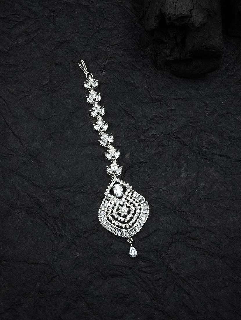 Elegant Silver-plated Maangtikka adorned with sparkling American Diamond and Cubic Zirconia. Perfect for parties, weddings and festivals. Shop now for affordable luxury statement.