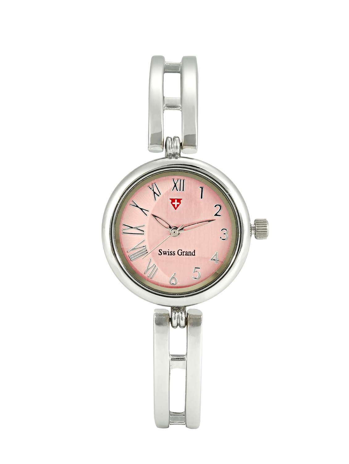 swiss grand sg-1178 silver pink coloured with silver leather strap analog quartz watch for women