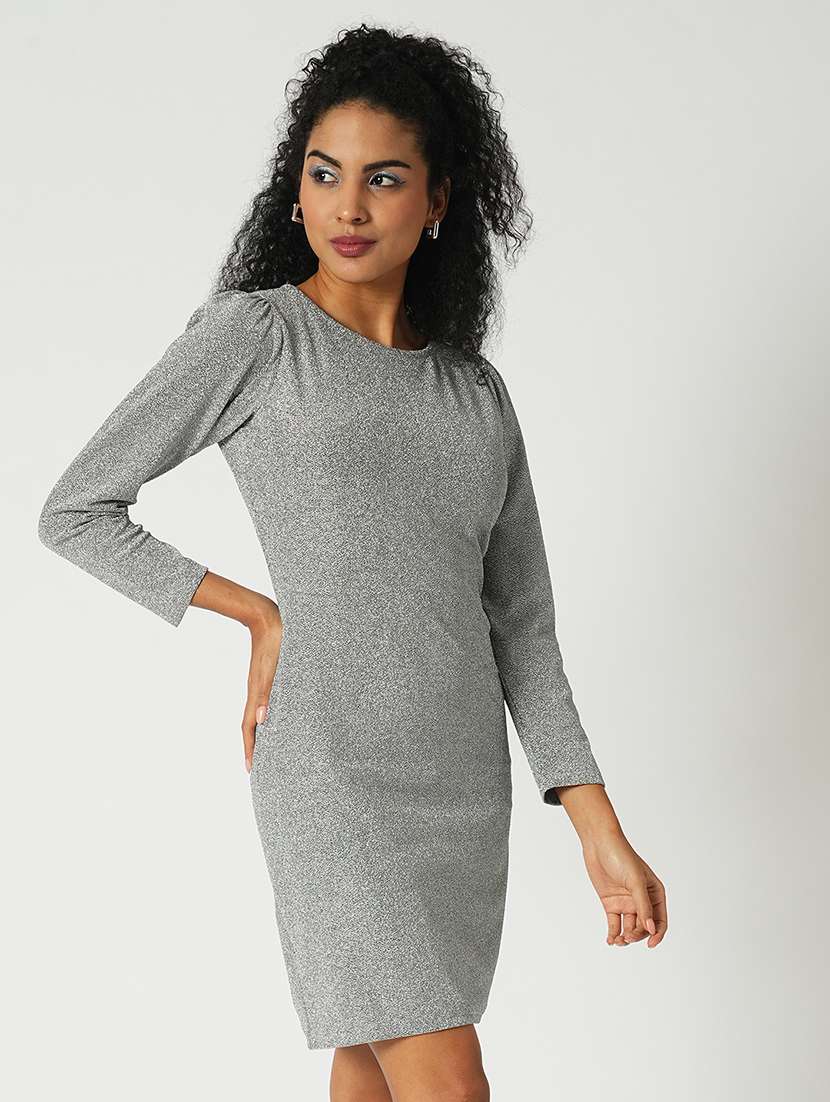 globus women silver round neck puff sleeves shimmer mini bodycon party dress