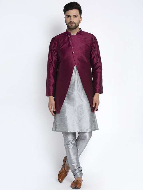 silver solid pure silk kurta pyjama set with burgundy jacquard ethnic jacket