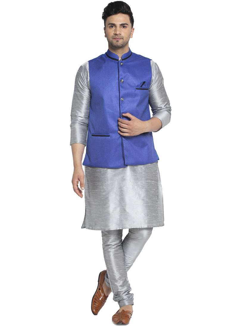 - » silver solid kurta pajama ethnic wear set with blue nehru jacket