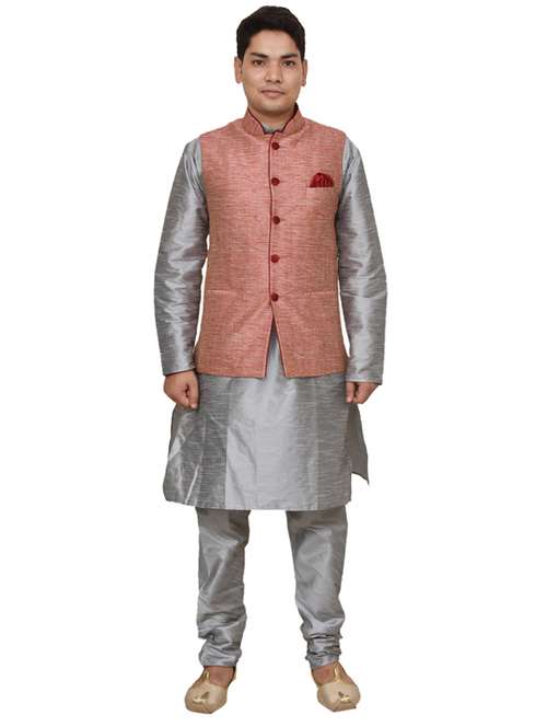silver silk blend kurta pyjama with jacket ethnic wear set