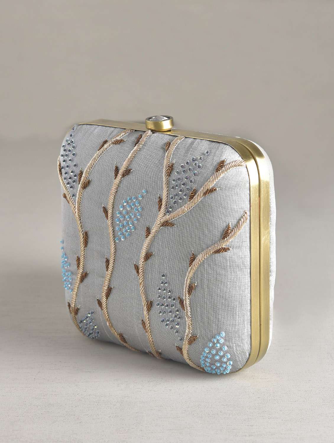 - » grey foliage hand embroidered clutch